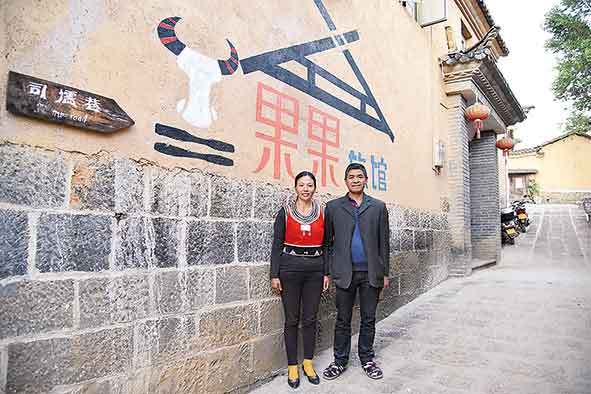 ▲2020年12月31日,中寨司莫拉佤族村村民李發(fā)果和丈夫在自家經(jīng)營(yíng)的旅館前。新華社記者林碧鋒攝