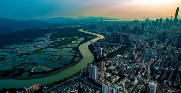 無人機(jī)拍攝的深圳和香港落馬洲河套地區(qū)及周邊風(fēng)光(2018年5月23日攝)。新華社記者 毛思倩 攝