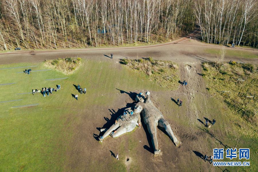 這是3月20日在比利時(shí)博姆市的德舒爾森林公園拍攝的“巨人”雕塑(無(wú)人機(jī)照片)。新華社記者 張鋮 攝
