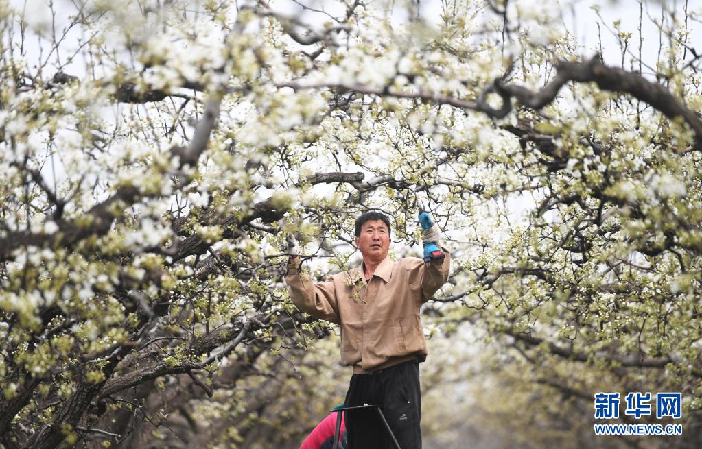 4月5日,河北省雄安新區(qū)雄縣雄州鎮(zhèn)馬蹄灣村果農(nóng)在梨園為梨樹剪枝。