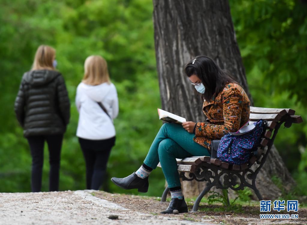 4月15日,一名女子在西班牙馬德里一個公園內讀書。