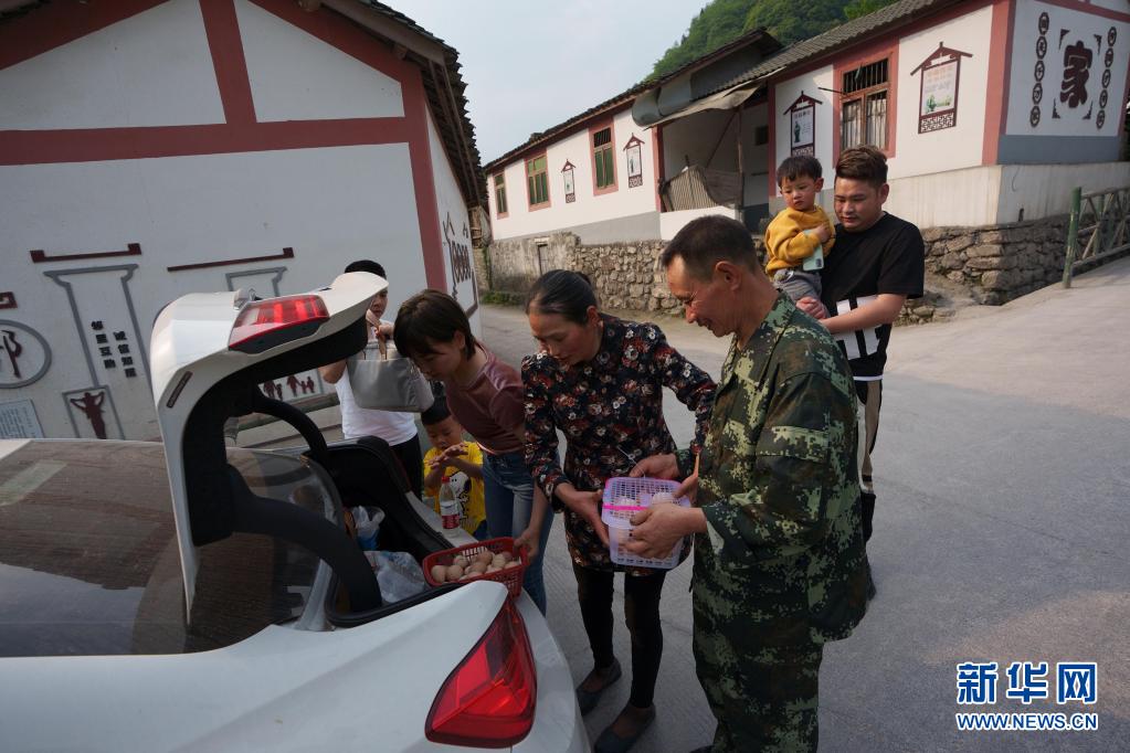 5月4日,女兒林苓一家準備返程時,林興聰、李蕓香夫婦給他們捎上雞蛋。 新華社記者 江宏景 攝