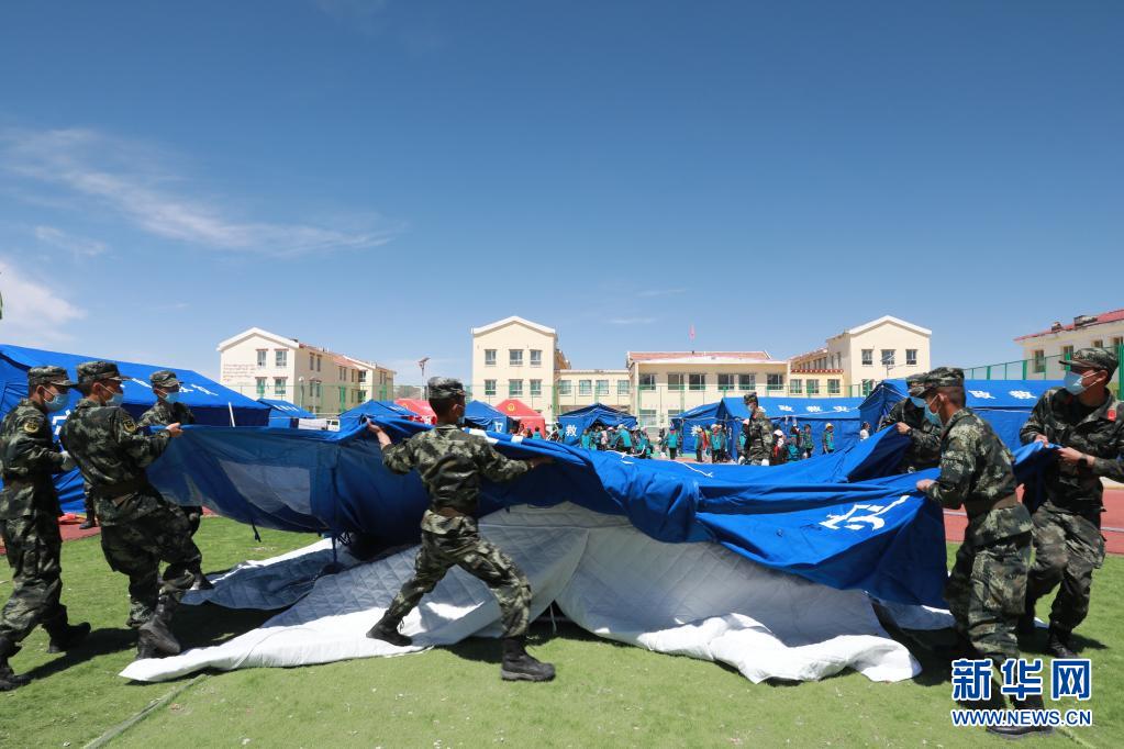 5月24日,武警青??傟牴逯ш牂C動大隊官兵為花石峽鎮(zhèn)藏文中心寄宿制小學(xué)搭建帳篷教室。新華社記者 劉芳 攝