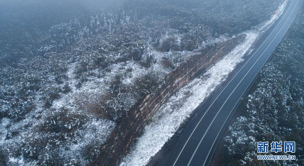 這是6月10日在澳大利亞新南威爾士州藍山地區(qū)拍攝的一條雪后公路(無人機照片)。