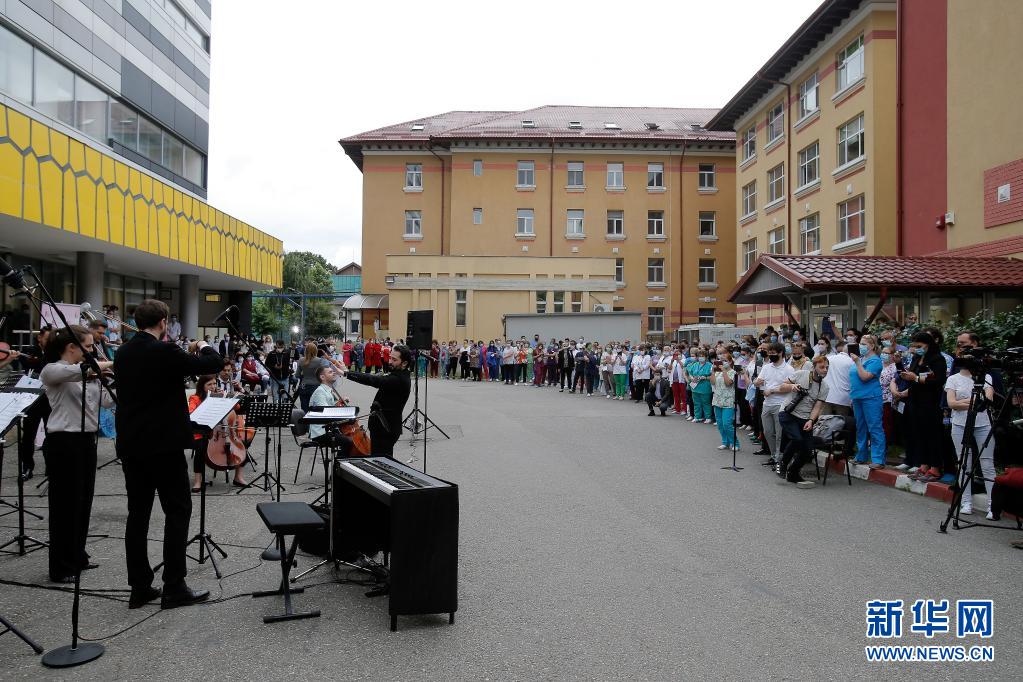 當(dāng)日,羅馬尼亞首都布加勒斯特一個樂隊(duì)在該國一家傳染病醫(yī)院——馬太·巴爾什醫(yī)院演出,向抗擊新冠疫情的醫(yī)務(wù)工作者致謝。