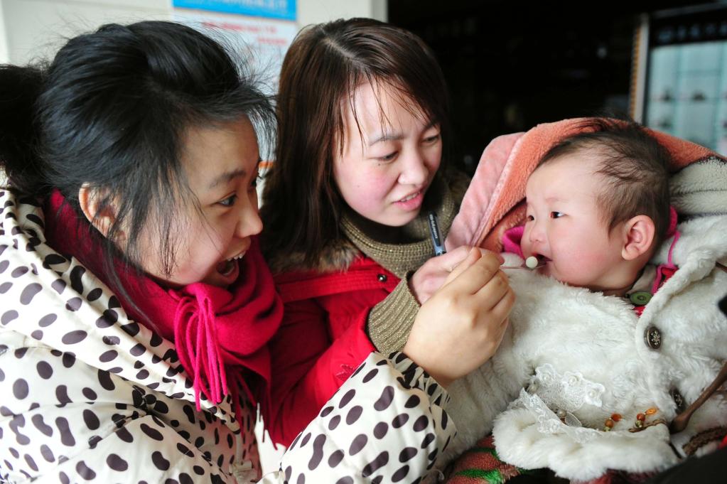 2011年3月1日,新疆烏魯木齊,工作人員給一名孩子喂食脊髓灰質(zhì)炎疫苗“糖丸”。 新華社記者 江文耀 攝