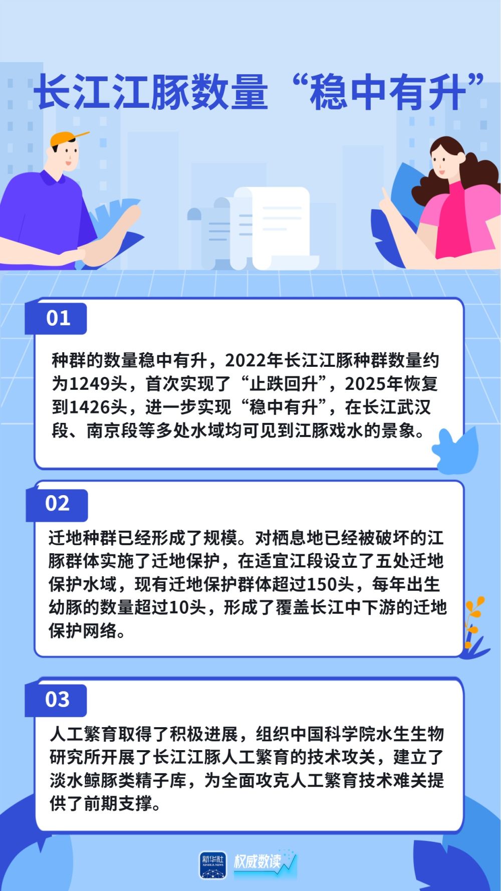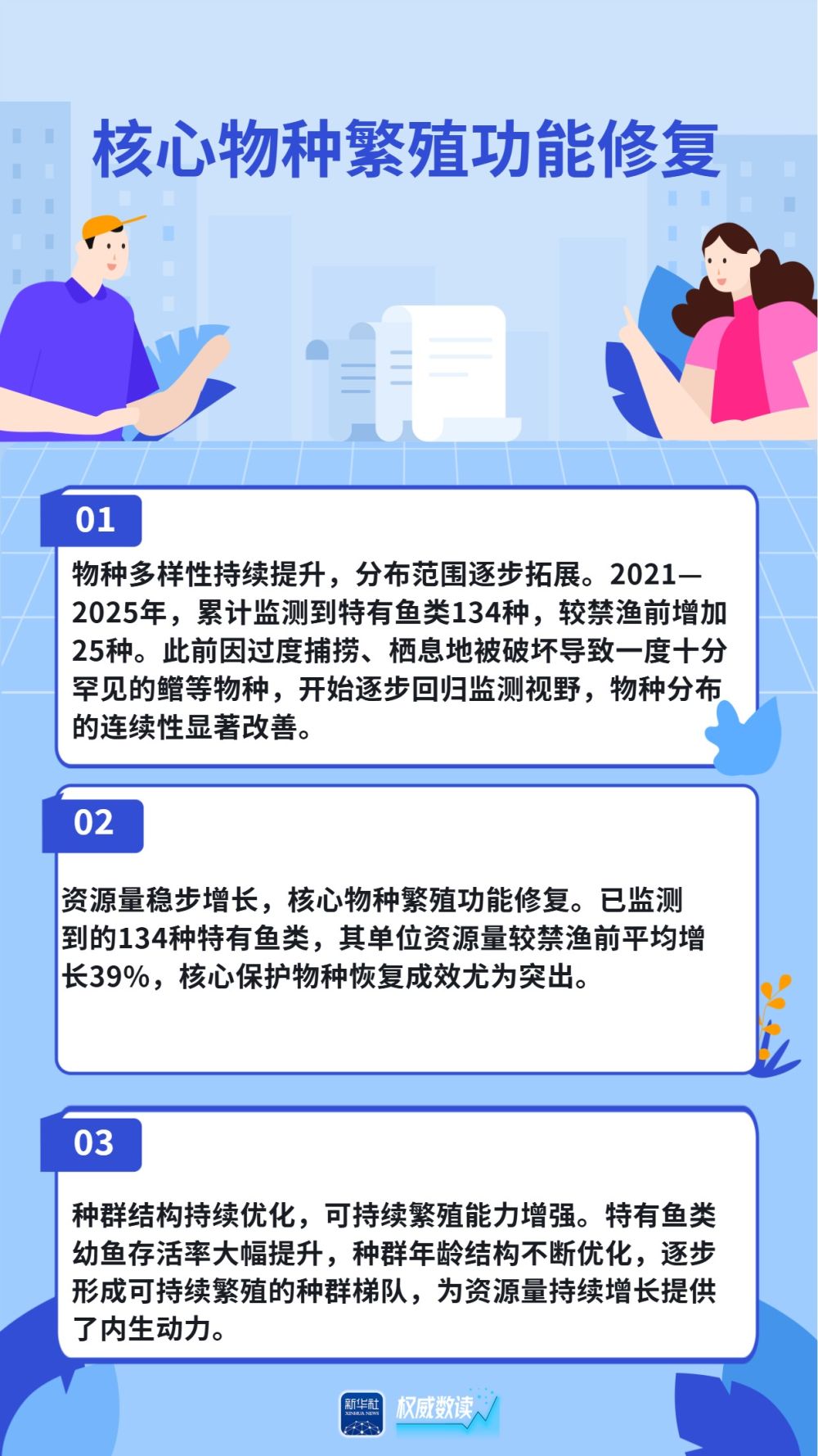长江江豚数量恢复到1426头,中华鲟放流规模连续两年超过100万尾,长江鲟自然产卵试验取得成功......国新办30日发布会上,农业农村部介绍,长江十年禁渔全面启动实施五年来,取得了阶段性积极进展和显著成效,母亲河长江生物多样性恢复持续向好,逐步重现生机活力。跟随海报,一起来看看吧。
