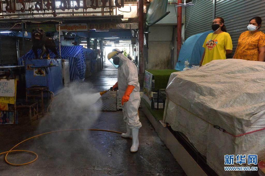 6月21日,工作人員在泰國首都曼谷一處生鮮市場進(jìn)行消毒。
