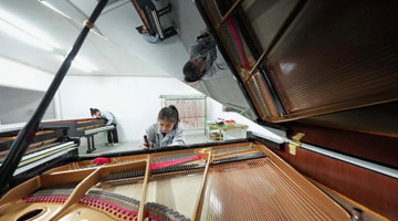 1月19日,工人在河北省肃宁县一家钢琴企业的生产车间工作。