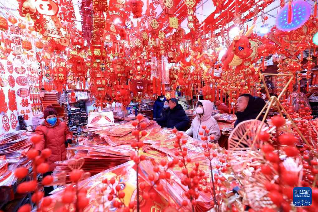 1月20日,人们在河北省石家庄市南三条年货批发市场选购春节饰品。