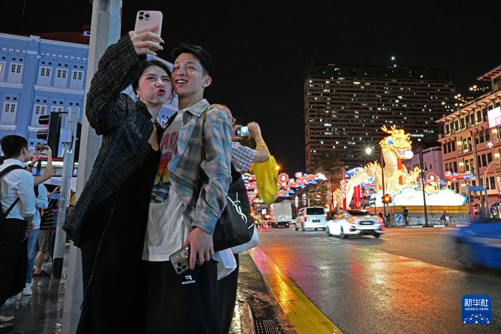 1月19日,游客在新加坡牛车水农历新年灯饰前拍照留影。新华社发(邓智炜 摄)