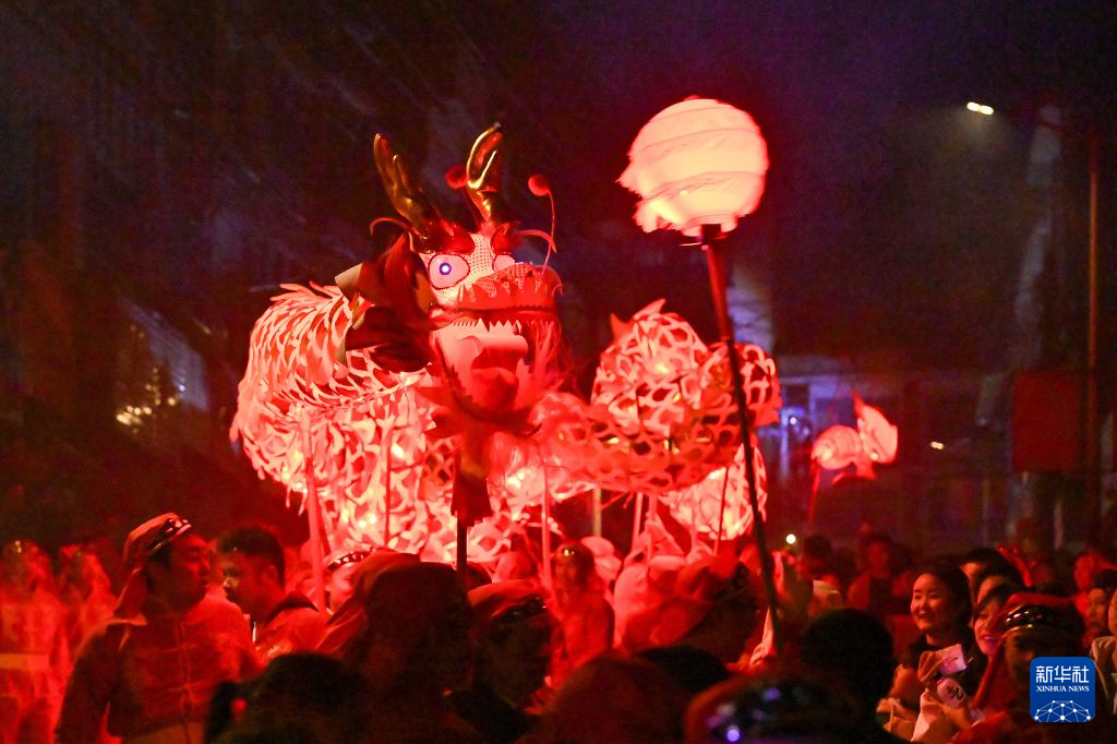 元宵佳节临近,人们进行传统舞龙表演,热热闹闹迎元宵。