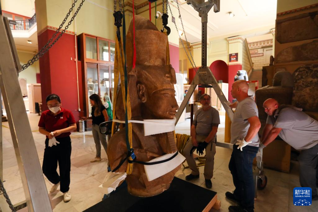 5月27日,在位于埃及首都开罗的埃及国家博物馆,工作人员对古埃及18王朝法老埃赫那吞半身像进行吊装。