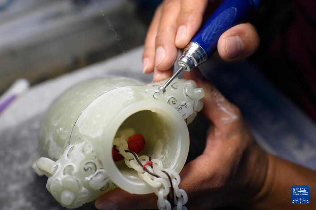 技师在张铁成工作室内进行玉雕创作(6月15日摄)。