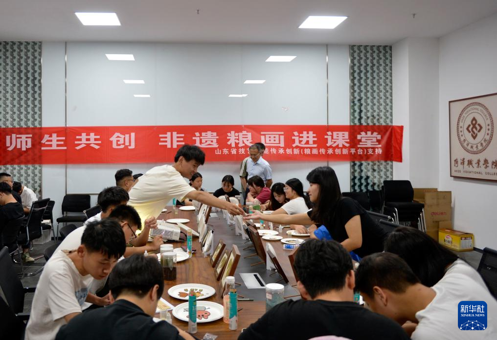 6月27日,学员在菏泽非遗传承馆学习制作粮画。新华社记者 刘力航 摄