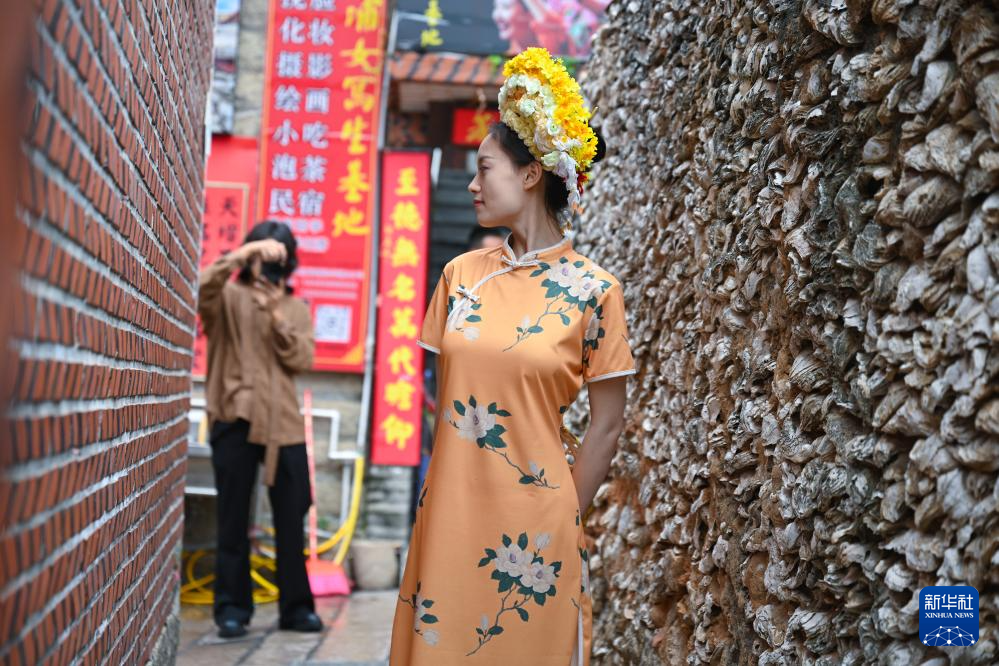 体验“簪花围”的游客在泉州市蟳埔村的蚵壳厝旁拍照(2023年10月27日摄)。