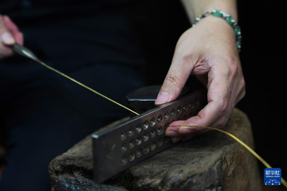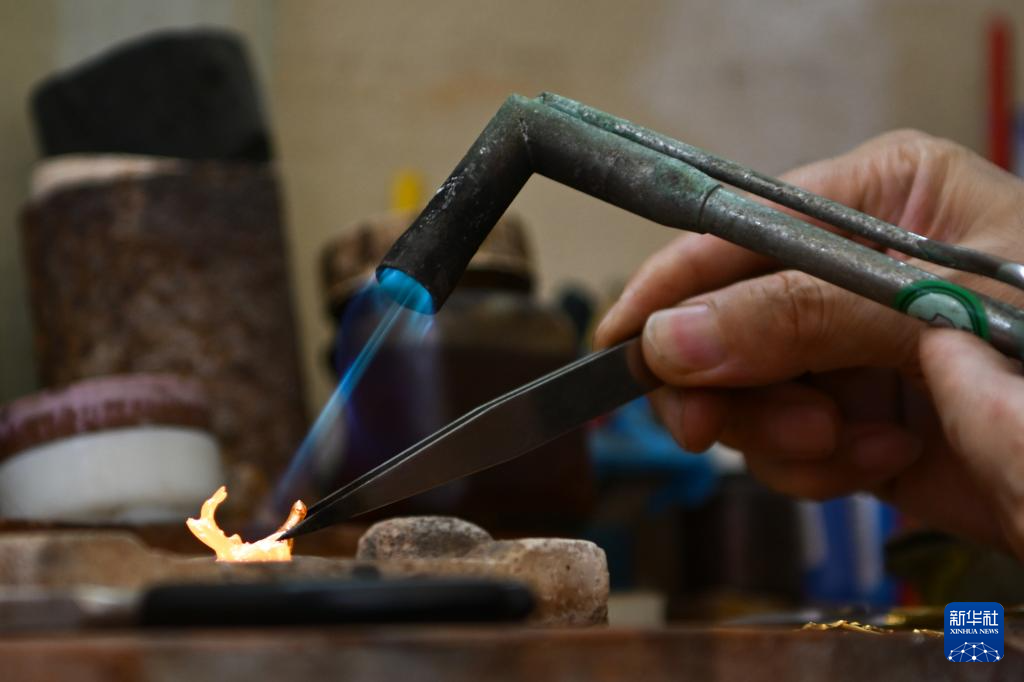 在福建泉州,王勇跃在工作室里制作一件蟳埔女金饰(8月28日摄)。