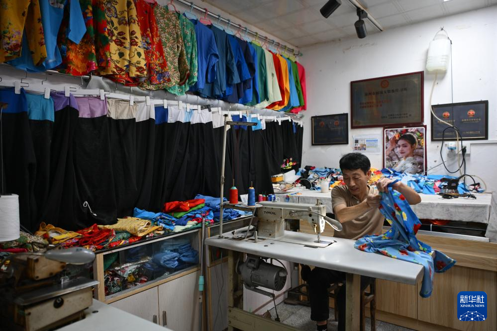 在福建泉州蟳埔村,蟳埔女习俗代表性传承人黄晨在工作室里缝制一件蟳埔女服饰(8月27日摄)。