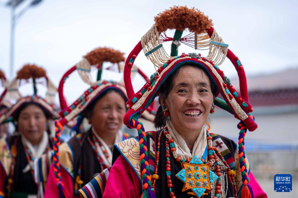 西藏日喀则市定结县,“萨尔谐钦”演职人员在整理头饰(9月25日摄)。