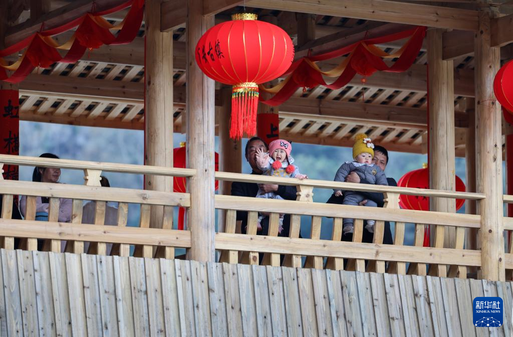 在宁德市屏南县长桥镇,修复后的万安桥通桥投用,村民带着孩子上桥体验(2024年1月21日摄)。