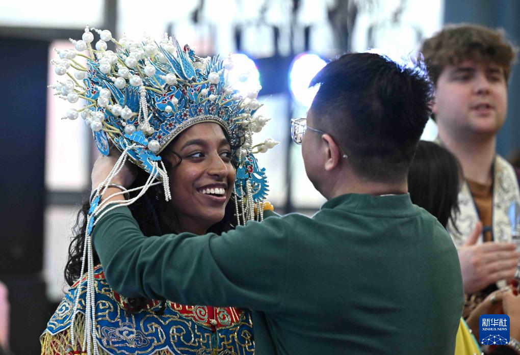 12月30日,美国大学生在河北省石家庄市京剧团体验。