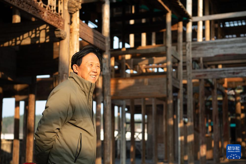 1月8日,在安徽省黄山市休宁县,工人在一处传统徽派古民居复建工地现场进行木料加工。