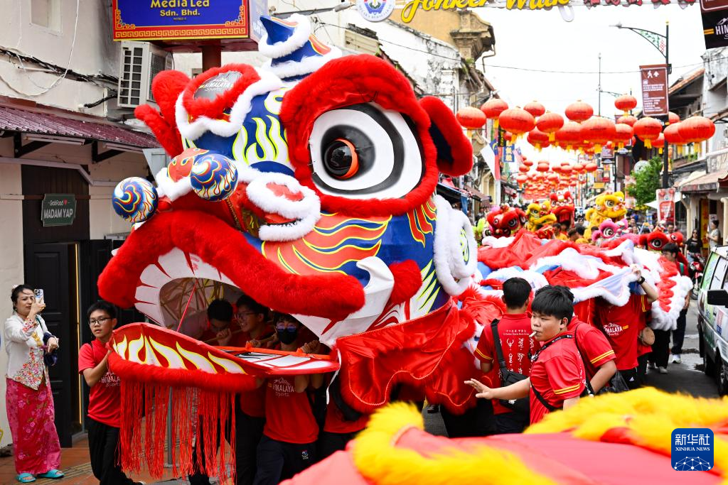 1月21日,在马来西亚马六甲市鸡场街,人们舞动“马中友谊瑞狮”,迎接新春 。