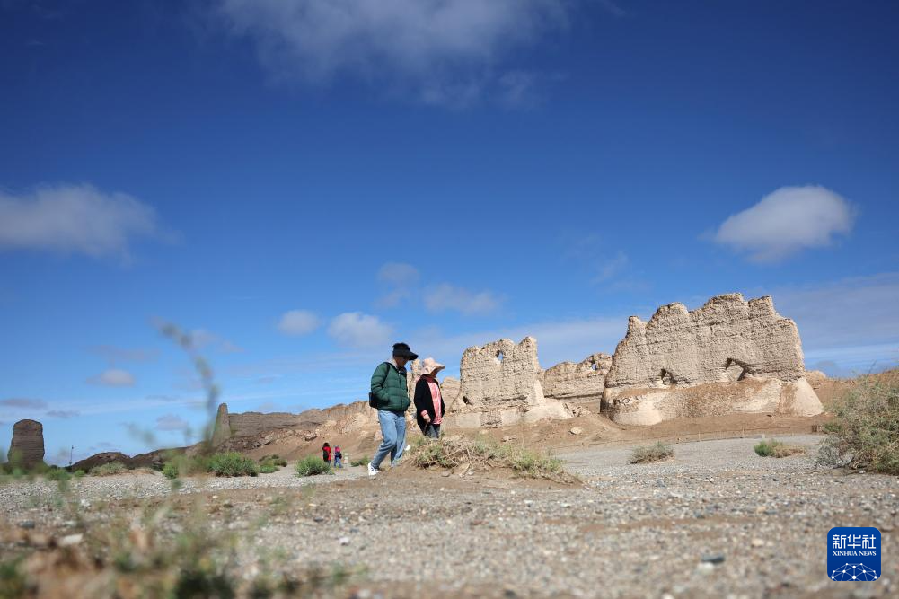 2024年9月4日,游客在雨后的玉门关遗址区大方盘城游览。