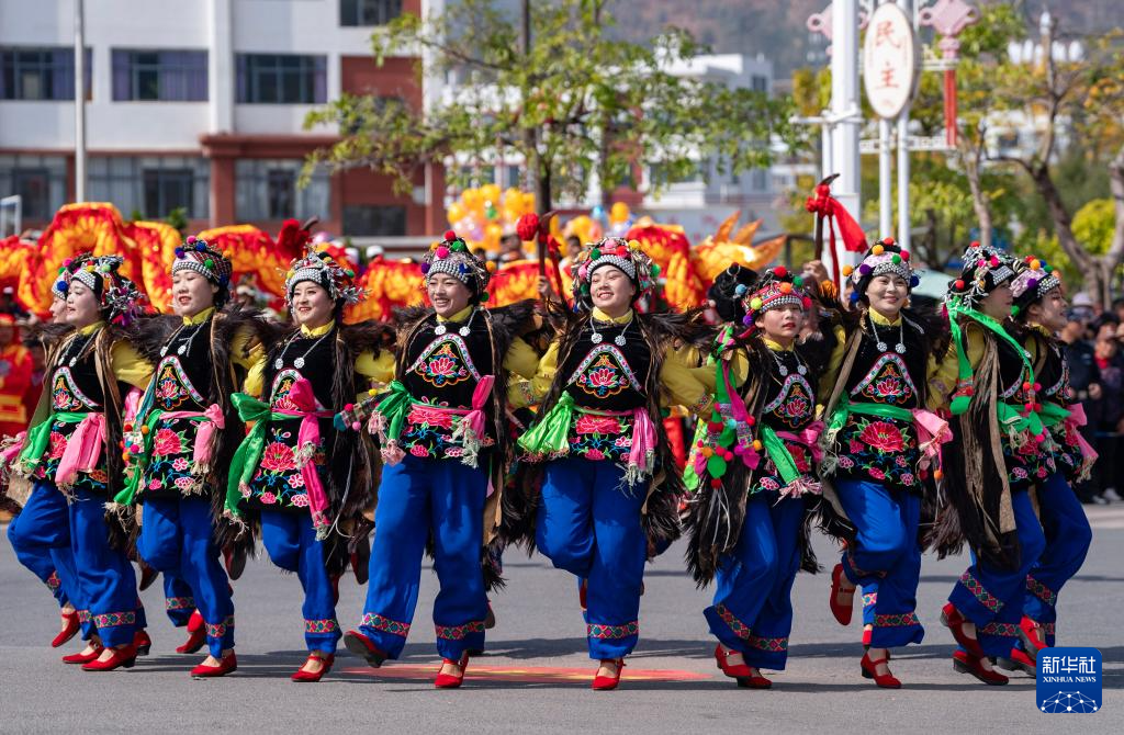鲁丽华(中)在南涧彝族自治县一年一度的龙灯会上和同事表演彝族舞蹈“三道弯”(2025年2月6日摄)。