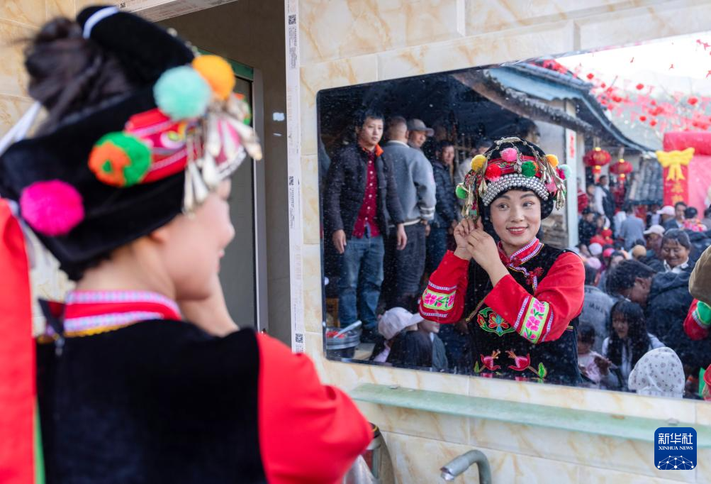 在南涧彝族自治县宝华镇拥政村,鲁丽华进行彝族跳菜表演前整理妆容(2025年2月7日摄)。