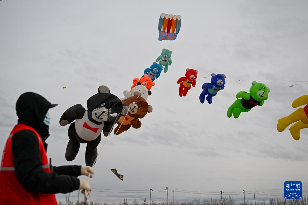 3月8日,在新疆都拉塔口岸房车露营基地,风筝爱好者放飞风筝。
