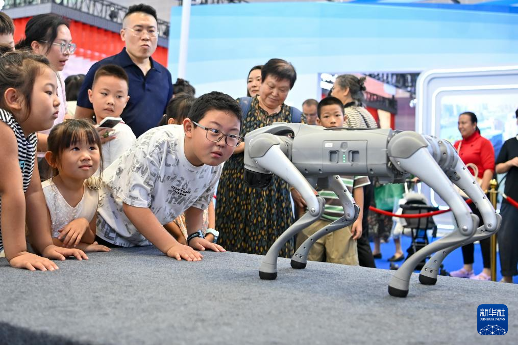 8月21日,小朋友们在第七届山西文化产业博览交易会上和机器狗互动。