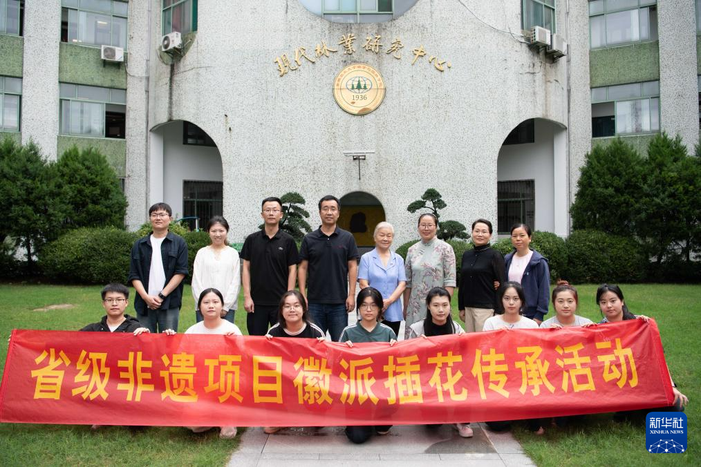 9月30日,在安徽农业大学林学与园林学院,徽派插花艺术传承团队核心成员付玉兰(后排右四)与团队成员及在校师生合影留念。