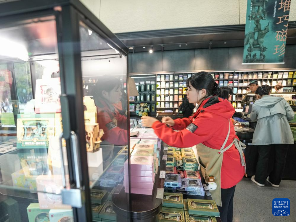 在四川省广汉市三星堆博物馆文创商店,工作人员往货架上补充文创产品(10月30日摄)。