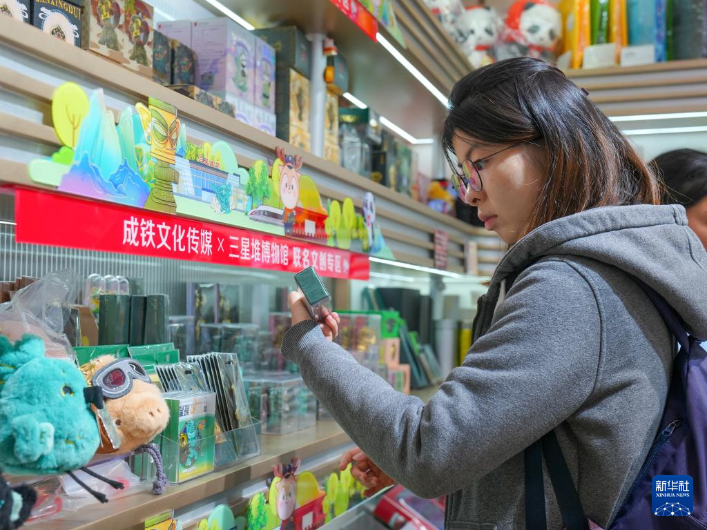旅客在位于成都东站的三星堆博物馆与铁路部门联名文创专区商店内选购文创产品(11月3日摄)。