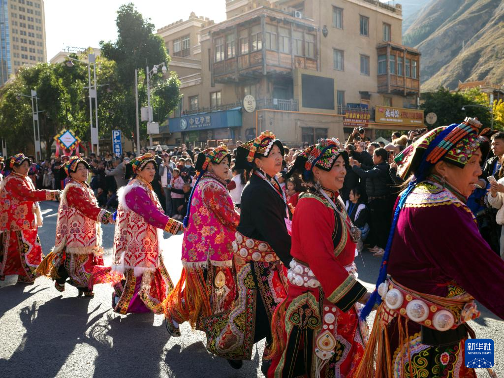 11月19日,在四川省汶川县城,身着民族服饰的妇女参加非遗大巡游活动。