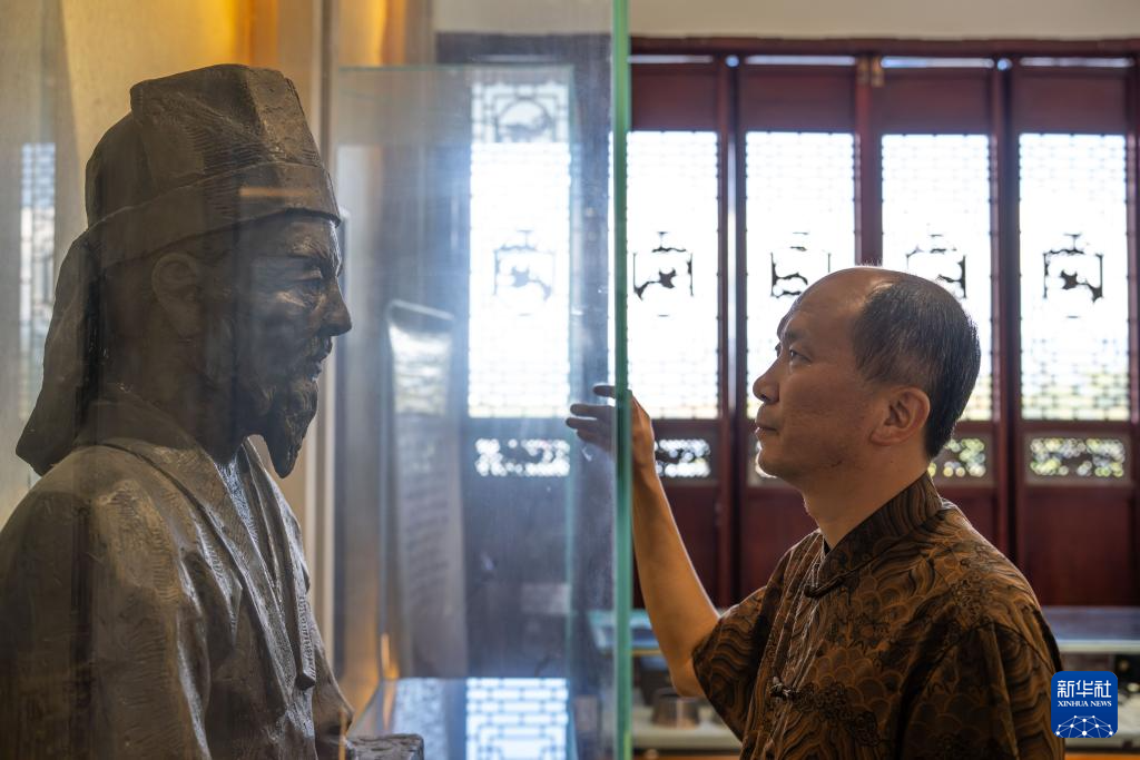 11月20日,在保山市永子棋院,李国伟注视李德章雕像。