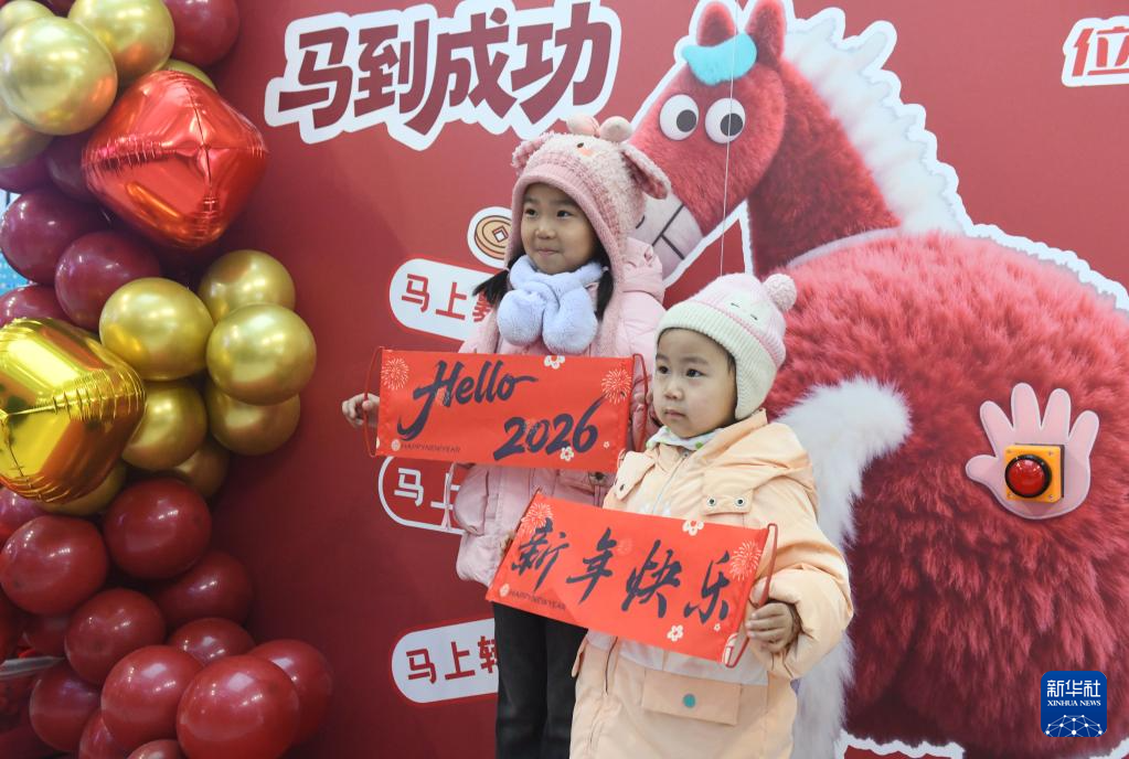 1月25日,小朋友在河北省石家庄新乐市一家超市免费拍摄照片。