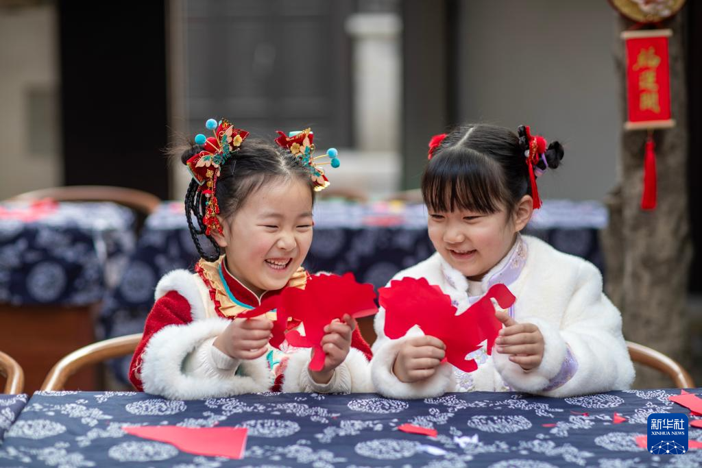 2月2日,在江苏省兴化市昭阳街道的毕飞宇工作室内,兴化市昭阳湖幼儿园的孩子们在老师的指导下创作以生肖马为主题的剪纸。