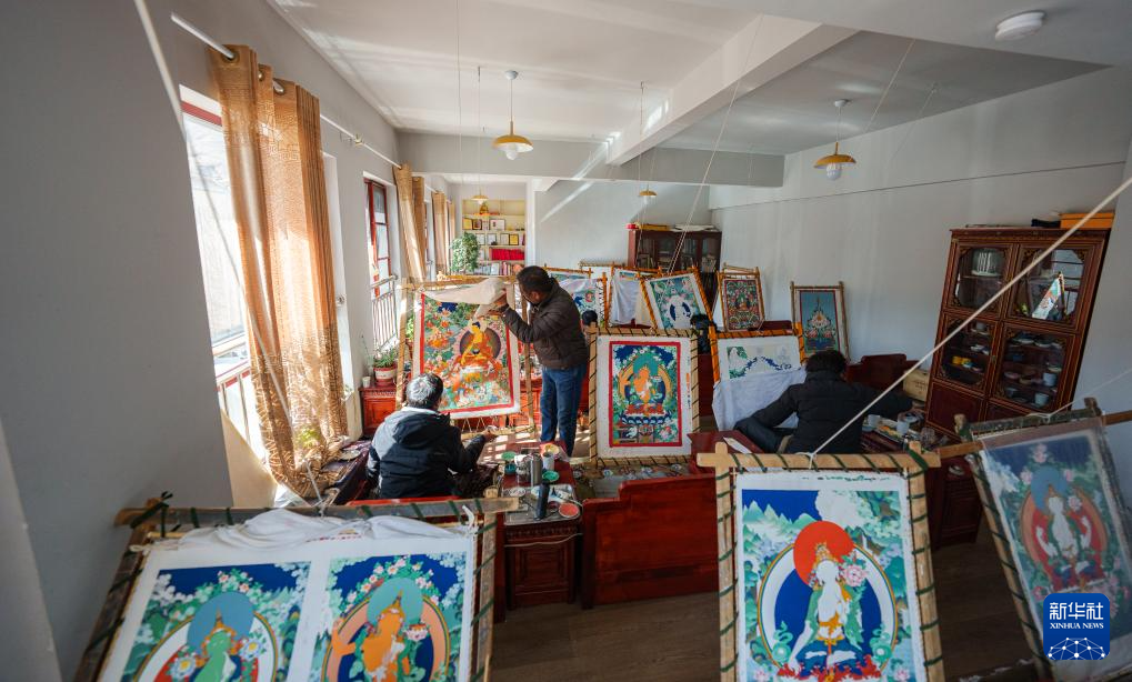 这是2月10日拍摄的西藏唐卡画院展厅。陈列的唐卡中有许多罗布斯达的作品。