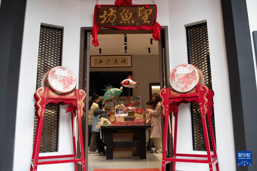 3月1日,在安徽省黄山市歙县北岸镇瞻淇村,游客在一家店铺内选购鱼灯文创产品。