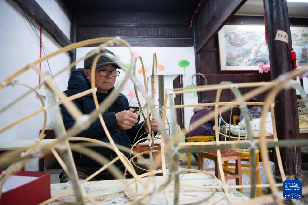 3月1日,在安徽省黄山市歙县北岸镇瞻淇村,瞻淇鱼灯非遗传承人汪观海在制作鱼灯。