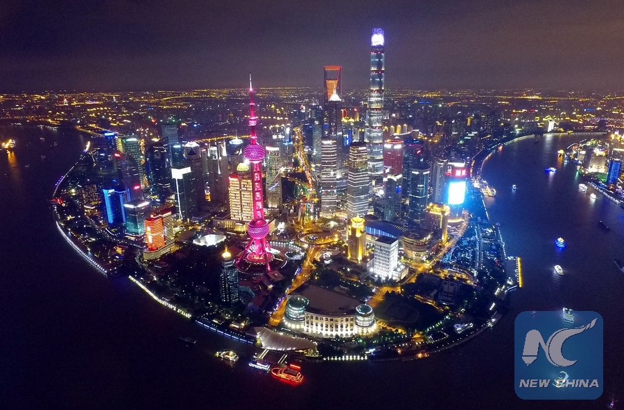 Photo taken on Oct. 4, 2015 shows an aerial night view of Shanghai, east China. (Xinhua)