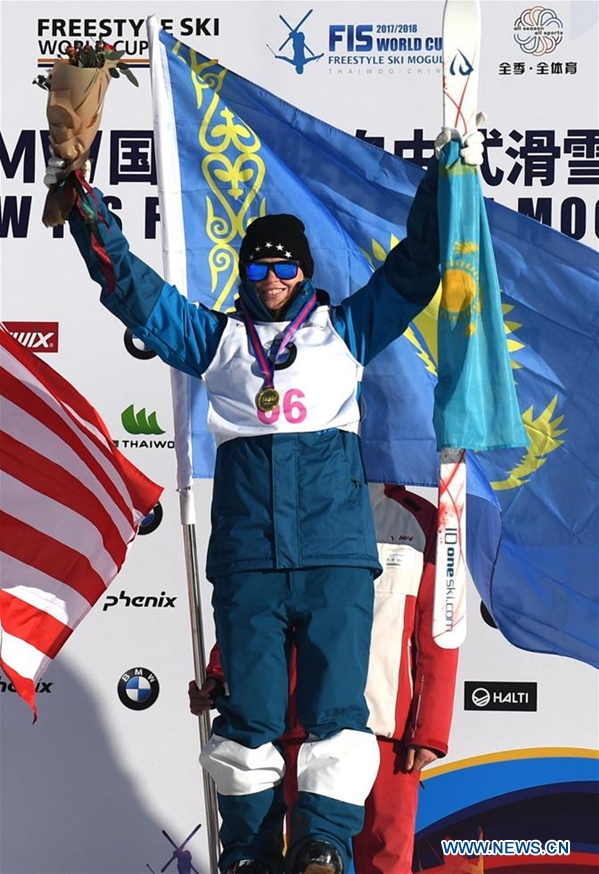 Yulia Galysheva of Kazakhstan celebrates on the podium after the ladies' Moguls on the Day 2 of the 2017-2018 Freestyle Skiing World Cup-Moguls & Aerials at the Thaiwoo ski resort in Chongli District of Zhangjiakou City, north China's Hebei Province, Dec. 22, 2017.Yulia Galysheva claimed the title with 80.88 points. (Xinhua/WangXiao)