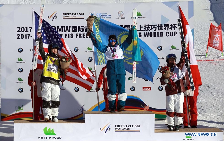Winner Yulia Galysheva (C) of Kazakhstan, runner-up Jaelin Kauf (L) of the United States and the third-place winner Andi Naude of Canada celebrate on the podium after the ladies' Moguls on the Day 2 of the 2017-2018 Freestyle Skiing World Cup-Moguls & Aerials at the Thaiwoo ski resort in Chongli District of Zhangjiakou City, north China's Hebei Province, Dec. 22, 2017. (Xinhua/Meng Jing)