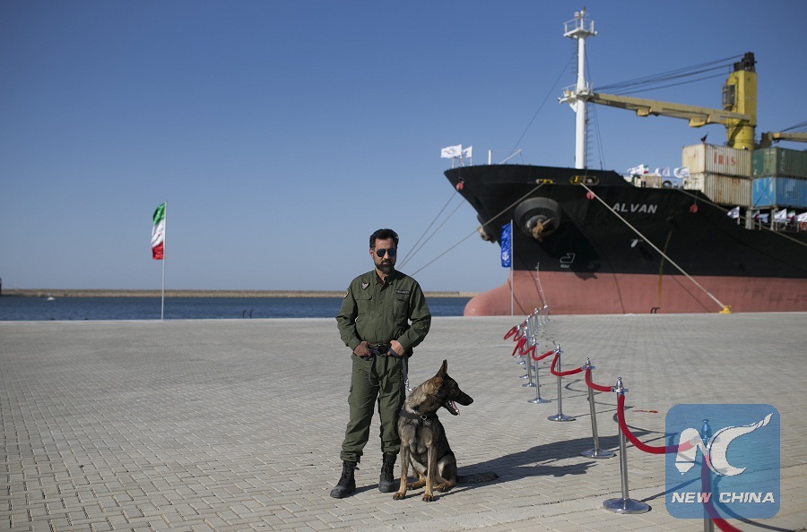 A security guard stands in front of a cargo ship during the opening ceremony of Shahid Beheshti Port in Chabahar, Iran, on Dec. 3, 2017. (Xinhua/Ahmad Halabisaz)