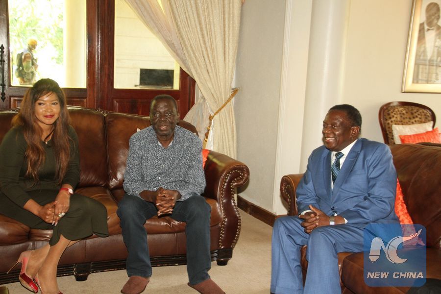 Zimbabwean President Emmerson Mnangagwa (R) meets with the Movement for Democratic Change-Tsvangirai (MDC-T) leader and former Prime Minister Morgan Tsvangirai (C) at Tsvangirai's home in Harare, Zimbabwe, on Jan. 5, 2018. (Xinhua/Wanda)