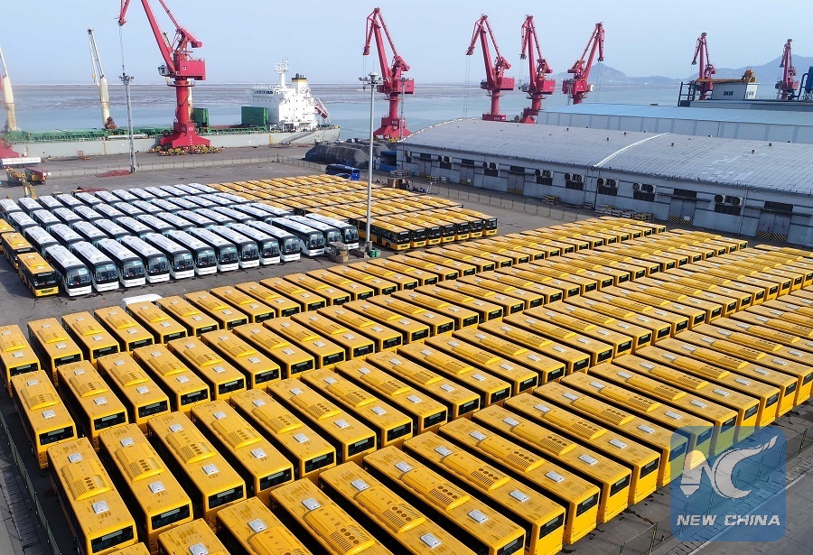 Buses are ready to be exported at the Lianyungang Port in Lianyungang City, east China's Jiangsu Province, Jan. 2, 2018. More than 500 buses at the Lianyungang Port were ready to be exported to Africa. (Xinhua/Wang Jianmin)