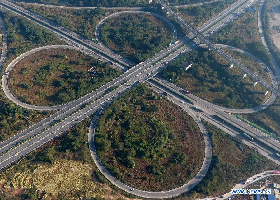 Photo taken on Dec. 21, 2017 shows an expressway interchange in south China's Guangxi Zhuang Autonomous Region. By making full use of its geographical location and the potential of coastlines and border areas, Guangxi capitalized on its advantages and played a bigger role in the Belt and Road Initiative. Through ports and the Beibu Gulf Economic Zone, the trade cooperation between Guangxi and ASEAN countries gained great prospects. (Xinhua/Lu Boan)