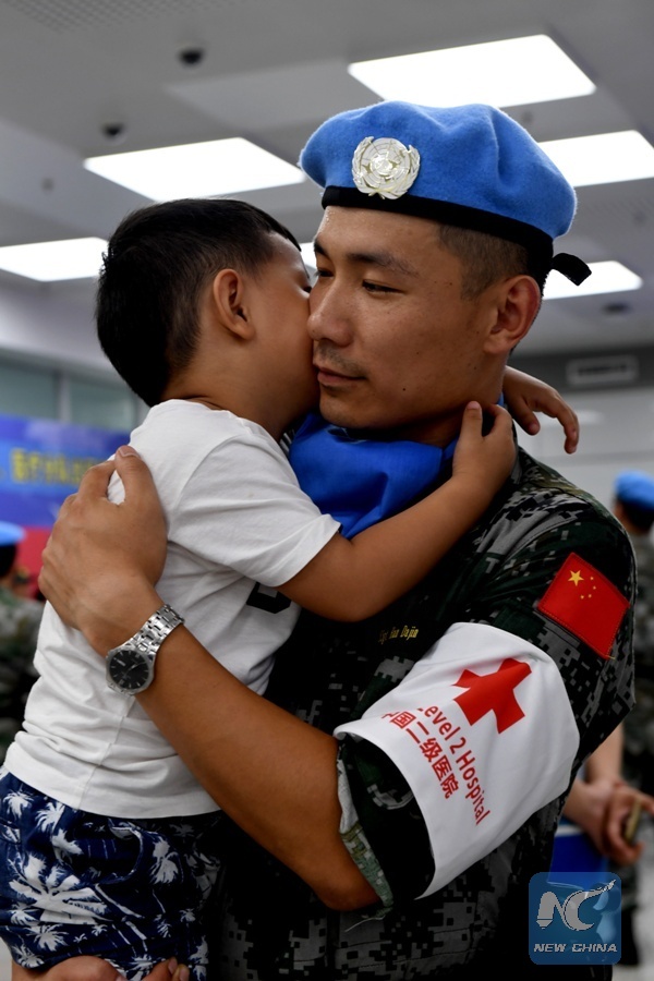 Han Dajin, a Chinese peacekeeper, bids farewell to his three-year-old son before leaving for South Sudan from Zhengzhou, capital of central China's Henan Province, Sept. 21, 2017. The 105-member squad of Chinese peacekeepers left for Wau in South Sudan on a one-year peacekeeping mission. (Xinhua/Zhu Xiang)